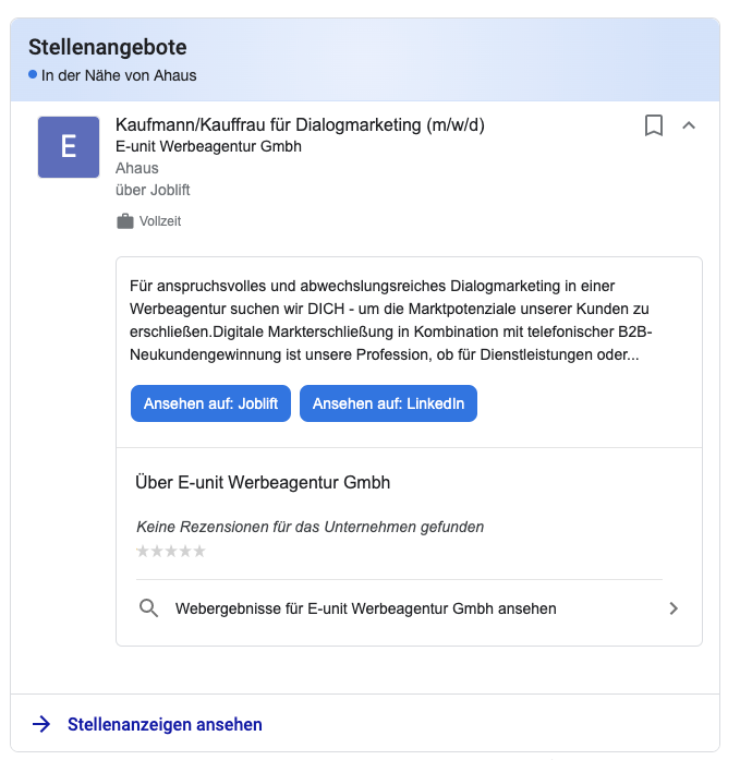 Die Stellenausschreibungen werden schematisch so aufbereitet das alle relevanten Informationen in die Google Suche einfließen und so auch von anderen Jobbörsen übernommen werden können wie zum Beispiel Indeed, Google for Job, LinkedIn und Joblist.